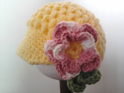 Gorrita amarilla adornada con una flor en rosa y blanco preciosa no?